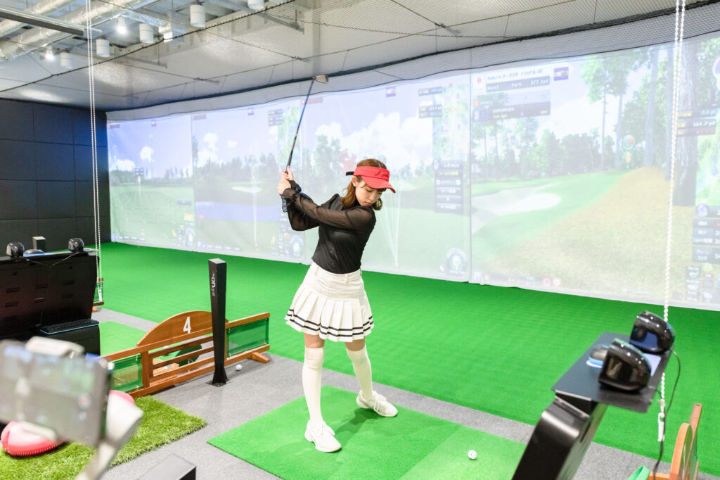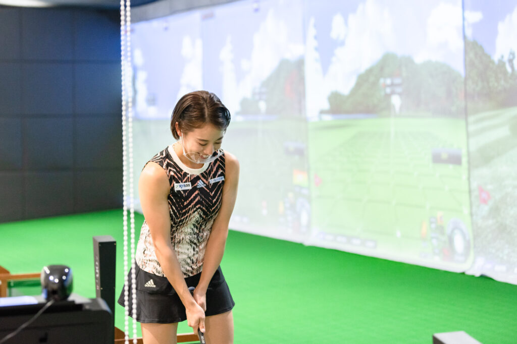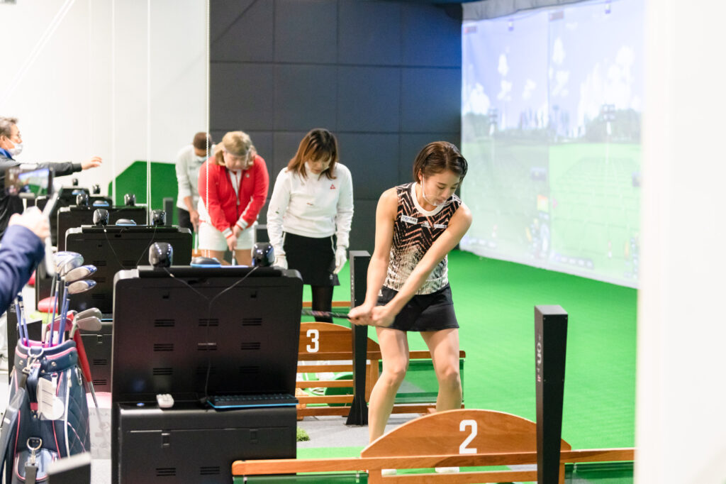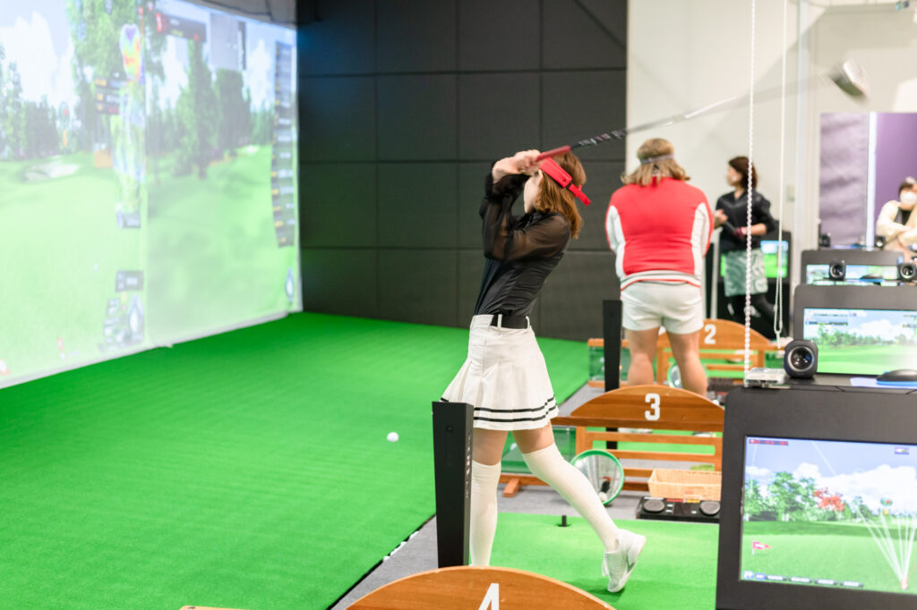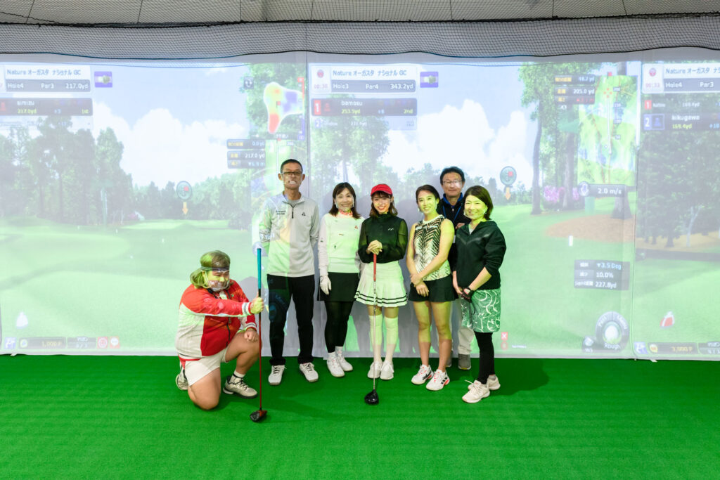 【ゴルフで遊ぼう】では山本瑠香さん、バモスわたなべさんにも参加していただき、会員様とシミュレーターを使用したコース対決を開催!!