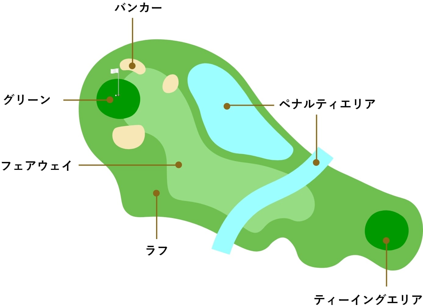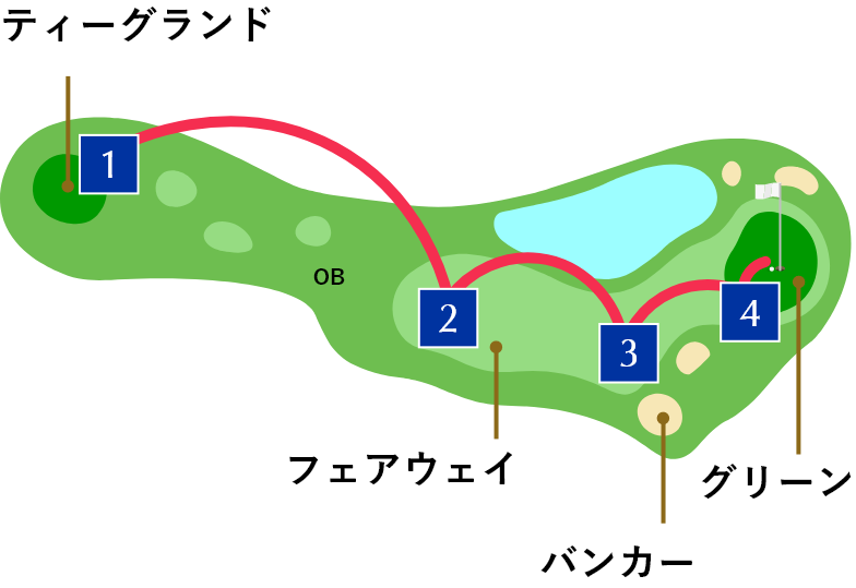 コースでは、まずティーグラウンドと呼ばれる場所からボールを打ち、カップインするまで同じボールを打ち続けます。これを18ホールまわっていかに少ない打数でまわれるのかを競います。まずはコースに出るうえで大切なことを学んでいきましょう!