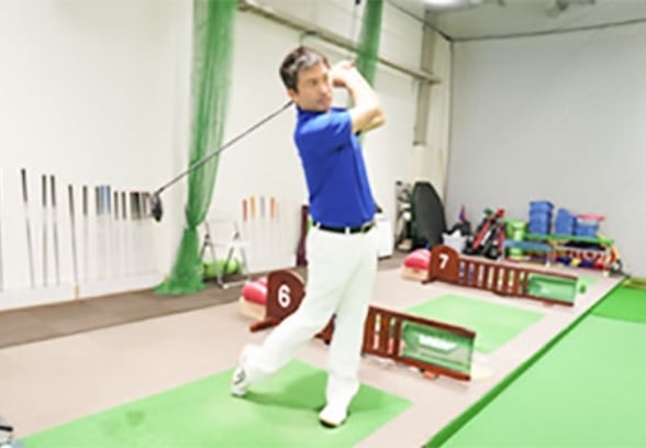 1レバースイングとは、手首を使わない範囲の振幅のスイングを言います。パターやグリーン周りのアプローチは、1レバースイングでスイングします。また、スイングが大きくなってもインパクトの形は同じです。