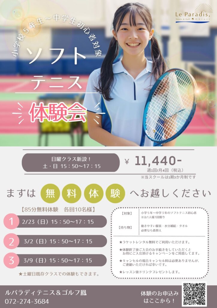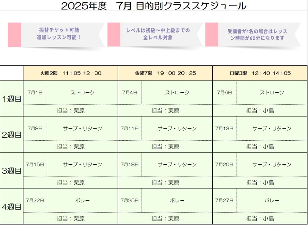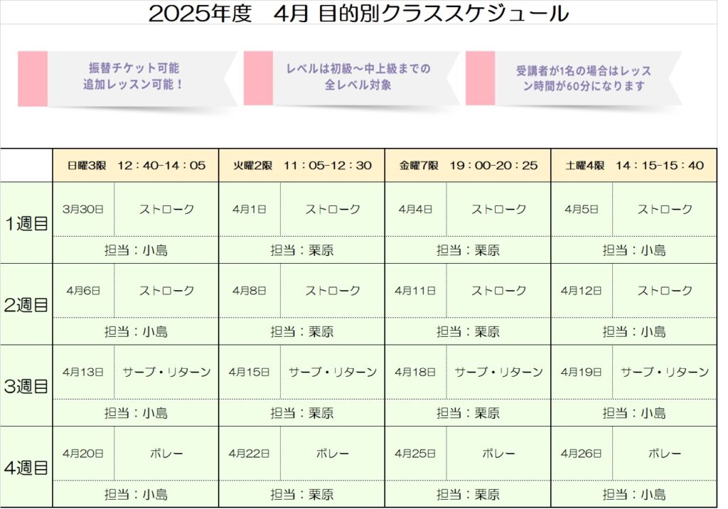 • 最終週のレッスンは、体験を承れない場合がございます。