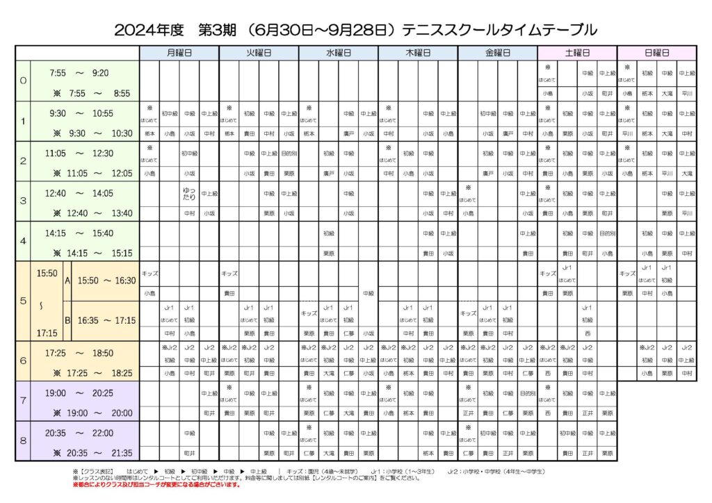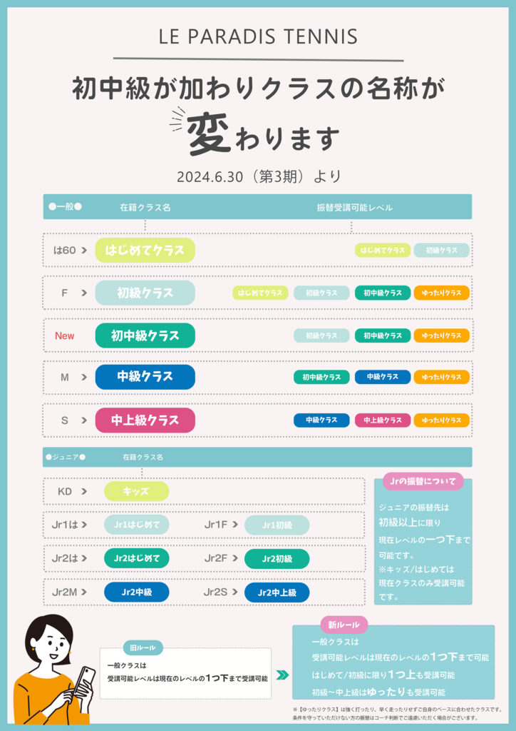 【1】第3期(2024年6月30日)より「初中級」クラス増設に伴いテニススクールのクラス名称を以下の様に表記変更させていただきます。