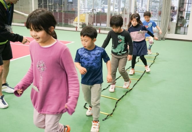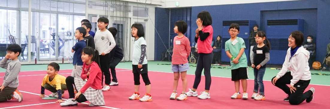 テニスの専門的な練習だけでなく、「走る」「止まる」「跳ぶ」「捕る」「投げる」「打つ」「連続」など、お子様の出来るレベルで様々な楽しいトレーニングを取り入れています。